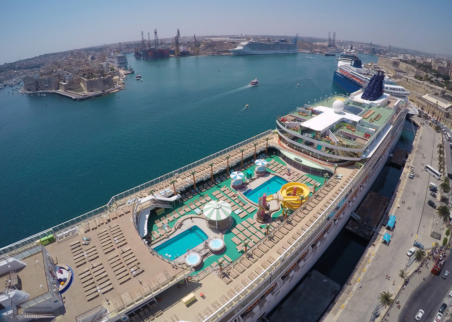 Wednesday 22nd July was a busy day at the port of Valletta, Malta. Five cruise ships from five different cruise brands graced the historic natural port with their presence, with over 14,000 passengers onboard and over 5,000 crew members, covering a total quay length of 1.37km.
